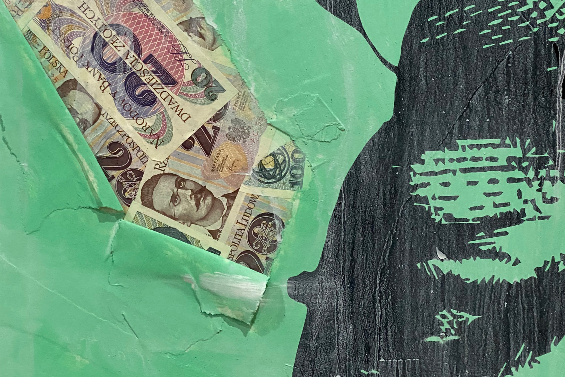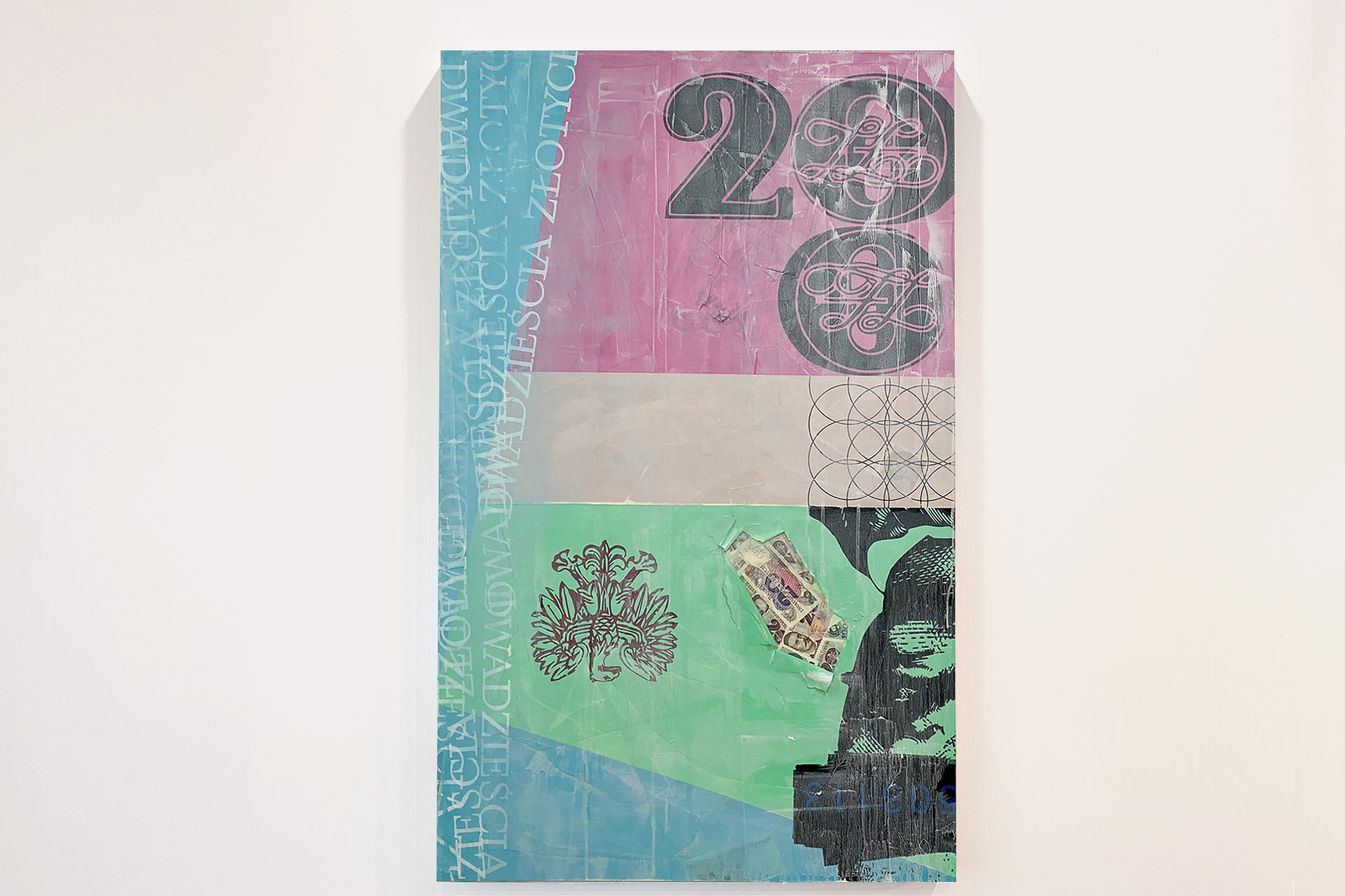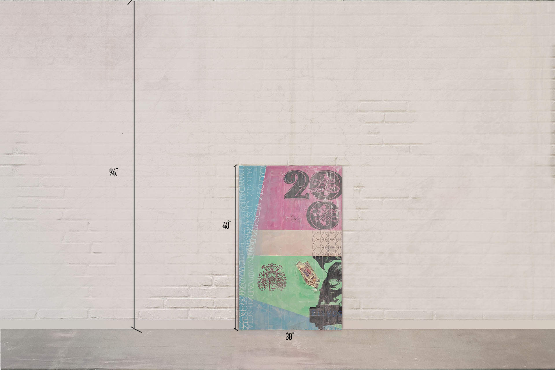 Overpainted on authentic 1980's Communist-era Polish złoty, this companion piece to Polska Drop offers a critical examination of the Eastern Bloc’s collapse. Designed to evoke the visual scale and structure of currency, the work interrogates the failures of Glasnost and Perestroika, repurposing defunct Soviet-backed banknotes as both material and metaphor. The layered composition—featuring concentric rings, textured surfaces, and intersecting fields of color—disrupts traditional notions of value, authority, and economic stability. By transforming a relic of a dissolved political order, this work from the Broken Banknote collection challenges the viewer to reconsider the ephemeral nature of state power and the economic ideologies that underpin it.