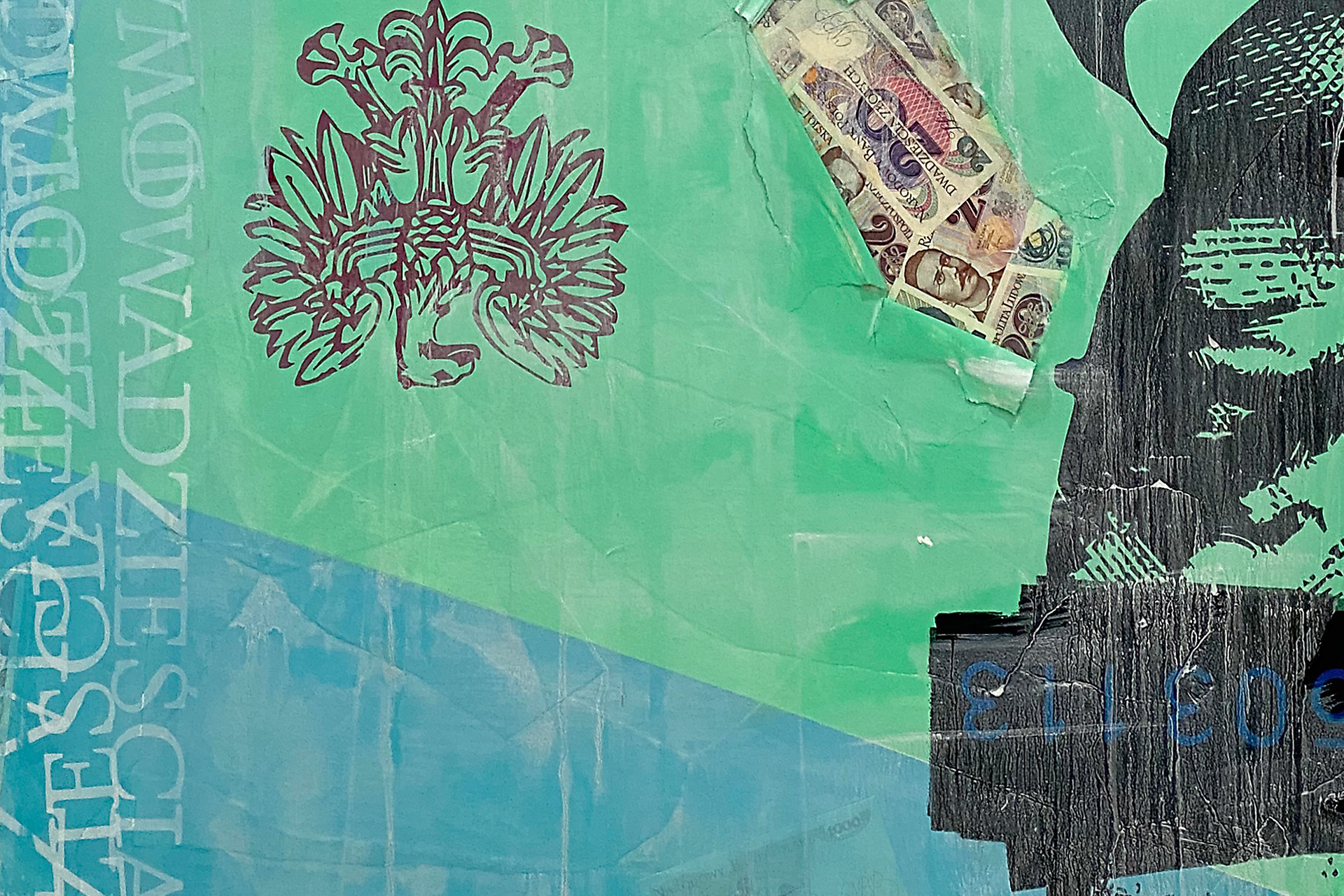 30x48x2 Oil, wax, archival paper and obsolete bank note on panel.